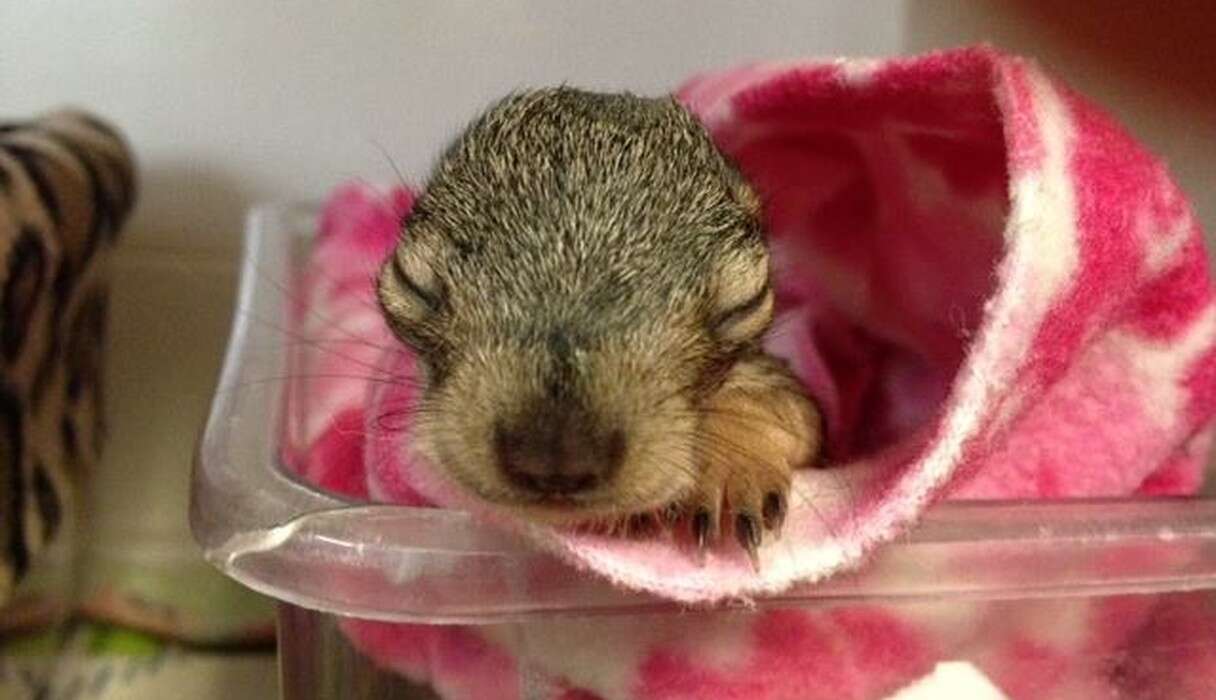 He has no fur and his eyes are still closed. The feeding schedule is also important when taking care of a baby squirrel. Keep the container clean.